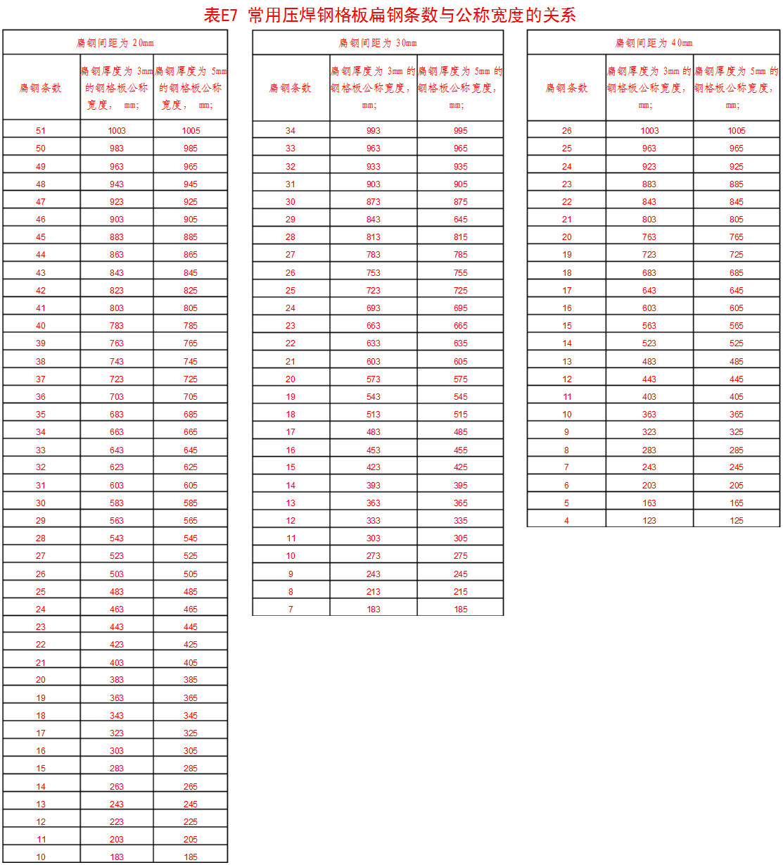 附錄表E.7 常用鋼格板扁鋼條數與公稱寬度的關系。